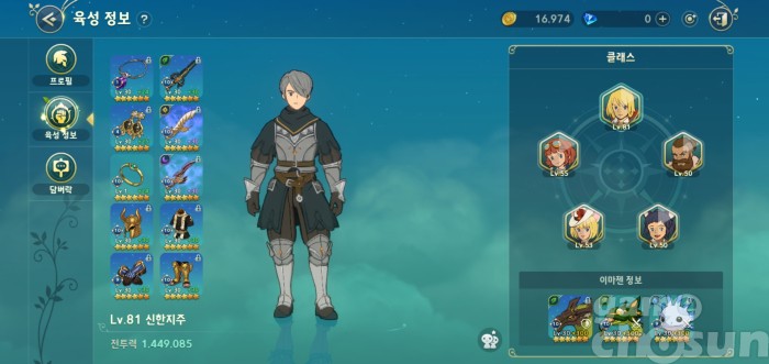 새롭게 1위를 차지한 신한 지주는 81레벨 소드맨을 육성 중이다. 이외에도 55레벨 엔지니어, 53레벨 위치, 50레벨 디스트로이어와 로그를 육성한 상태다. 장비를 살펴보면 반지를 제외한 모든 부위를 희귀 4성 장비로 채웠다. 이마젠은 4성 희귀 이마젠인 '신록'외 4성 400강 이마젠 두 마리를 착용했다.