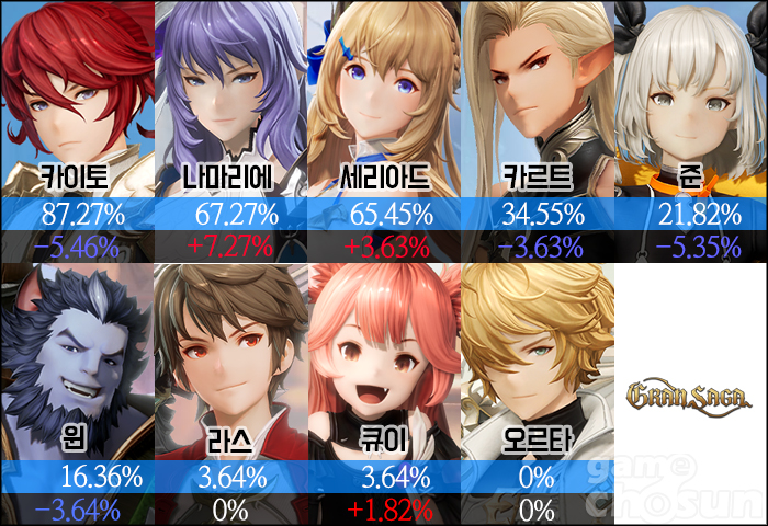 랭커들은 여전히 '카이토-나마리에-세리아드'를 선호하는 모습을 보여줬다. 카이토의 선택률이 약간 하락한 대신 나마리에와 세리아드의 선택률이 상승하는 변화가 있었지만, 여전히 4위 이하 그룹과 큰 차이를 보여주고 있다. 에스프로젠 서버의 경우 다섯 명의 랭커 모두 카이토, 나마리에, 세리아드 조합을 선택하는 진풍경을 연출하기도 했다.