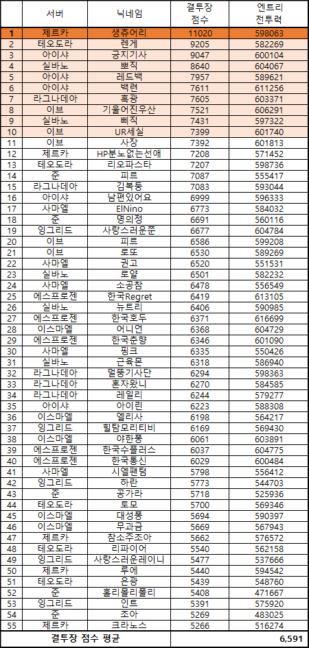 * 전투력 등 각종 순위는 결투장 랭킹 TOP5에 입성한 게이머 기준이므로 누락된 게이머가 있을 수 있습니다.