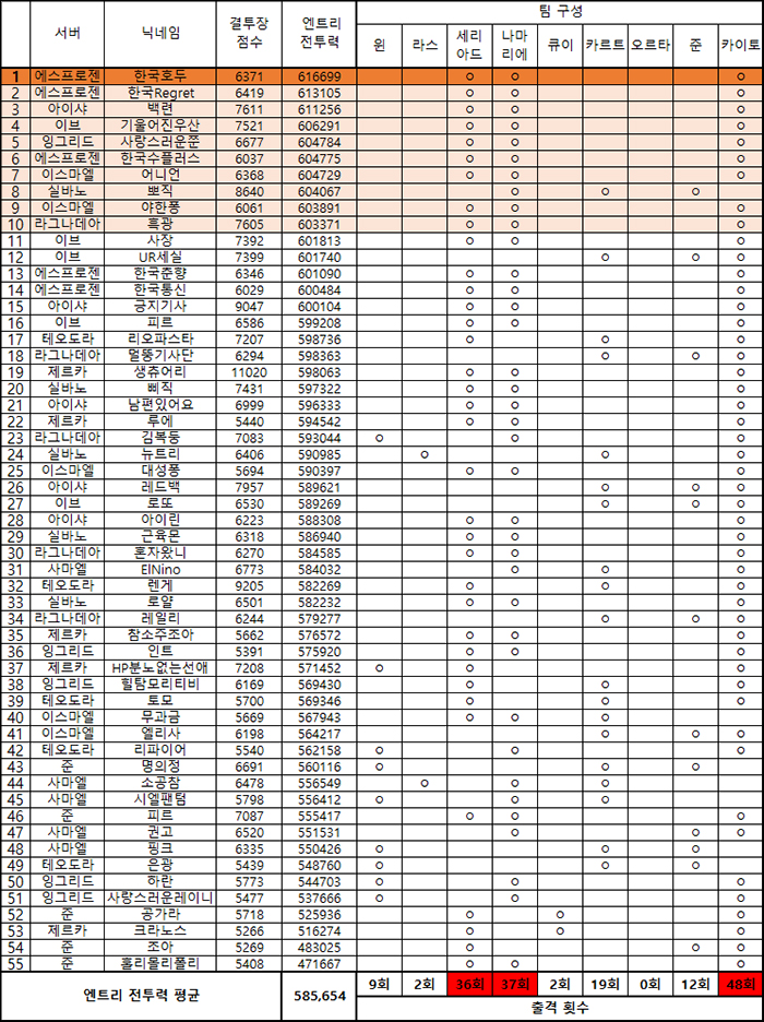 ■ '한국호두' 전 서버 결투장 엔트리 전투력 1위 달성