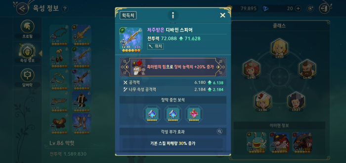 장비는 수많은 배경 장비를 챙긴 가운데 일부 장비를 흑마법으로 강화하고 있는 상황이다. 흑마법의 힘을 부여한 장비는 장비 능력치가 20% 증가하지만, 희귀한 재료인 '흑마법 결정'이 무려 장비 당 1천 개씩 소모되는 강화법이다. 상위 랭커들은 막힛과 마찬가지로 장비 능력치를 극대화하기 위해 유물 전장과 카오스 필드 보스를 공략하며 흑마법 부여 및 강화를 진행 중이다.