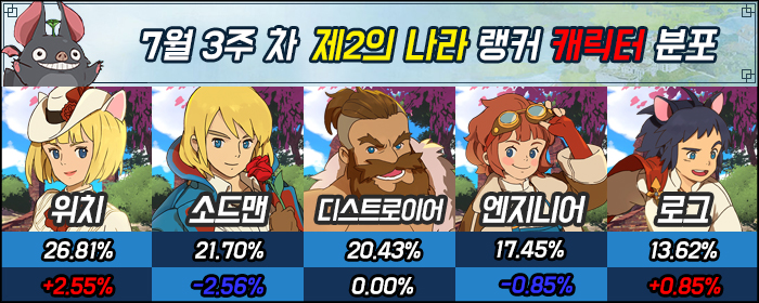 엔지니어와 로그는 여전히 하위권에서 점유율을 주고받고 있다. 두 캐릭터 모두 원거리 캐릭터라는 이점이 있지만, 보조 직업이라는 인식이 강하기 때문에 당분간 하위권 탈출은 어려워 보인다.