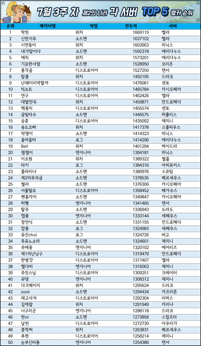 - 집계는 11일 11시부터 약 1시간 동안 실시됐으며, 누적 랭킹 메뉴의 캐릭터 전체 랭킹을 기준으로 상위 다섯 명까지 선별한 것이다. 집계 시간 동안 랭커들의 활동에 따라 오차가 발생할 수 있다.