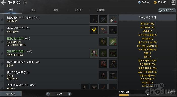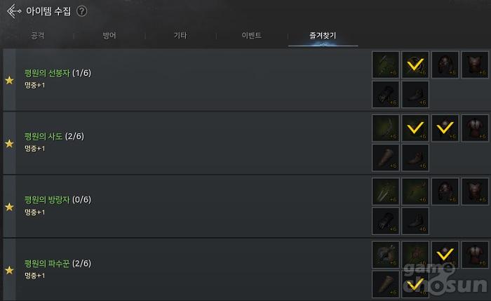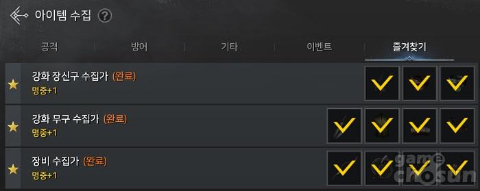 따라서 아이템 수집에서 눈여겨봐야할 능력치는 명중과 각 클래스의 공격 방식에 따른 명중 보정 스탯(근접 명중/ 원거리 명중/ 마법 명중)이다. 우선 아이템 수집에서 획득할 수 있는 명중 능력치는 총 28이다. 이중에서 비교적 완성 난이도가 낮은 것으로는 총 3종이 있다. 바로 '장비 수집가'와 '강화 무구 수집가', '강화 장신구 수집가'다. 해당 아이템 수집 목표는 강화가 필요없고 일반 등급 장비만 획득하면 되므로 가장 먼저 완성해야할 아이템 수집 목표다.