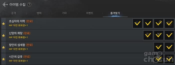 MP 자연 회복량을 증가시켜주는 아이템 수집 목표 중, 초반부터 쉽게 달성할 수 있는 것으로는 총 4종이 있다. 총 4개의 아크 메이지, 다크 위저드, 세인트, 팔라딘의 일반 등급 무기를 모으는 '초심자의 저력'과 신앙 시리즈의 갑옷 및 신발과 더불어 신앙의 마법구를 모으는 '신앙의 희망', 그리고 일반 등급 갑옷 2종을 6강까지 만들어 등록하는 '시간의 갑옷'이 대표적이다. 장인의 반지 및 장인의 벨트 1강을 등록해야하는 '장인의 섬세함'은 장신구 강화석을 필요로 한다는 단점이 있다.