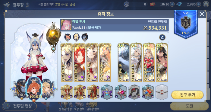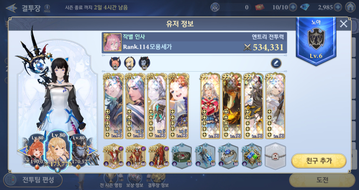 물론 모든 랭커가 이 국민 조합을 사용하는 것은 아니다. 일부 랭커는 '카르트'와 '준'을 주축으로 파티를 꾸리는가 하면 어떤 랭커는 고전적인 윈큐세 조합으로 상위권을 유지하고 있다. 이에 게임조선은 결투장 조합의 고착 현상이 이어지는 가운데 이에 대응하는 랭커들의 차선픽을 살펴봤다.