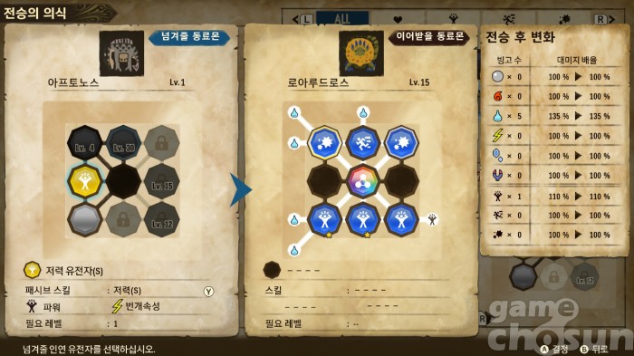 전승의 의식의 장점은 육성 파트의 핵심 시스템이면서 초반부터 사용할 수 있다는 점이다. 모든 스토리가 끝나야 비로소 육성을 즐길 수 있었던 전작과 달리 스토리즈2에선 스토리 도중에도 다양한 기술을 사용하는 몬스터를 만들며 즐겁게 놀 수 있다. 물론 스토리가 끝난 후에는 더 많은 유전자가 해금돼 더 폭넓은 동료몬 육성이 가능하다.
