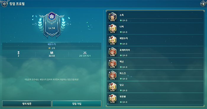 손소독제: 매주 요일과 시간을 정해 킹덤 영지에 모여서 음식을 한상 차려놓고 대기하다가 던전도 하고, 디펜스도 합니다! 파티 조합은 파티장만 정해놓고, 유동적으로 움직이고 있으며 디펜스의 경우 속성에 따라 파티를 나누기도 합니다.