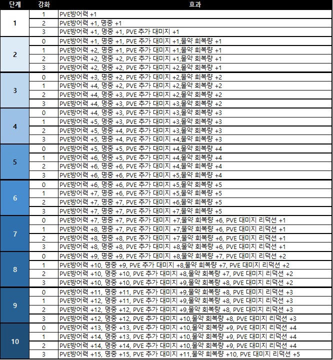 기존 명상각인과 동일하게 알테리운 용액과 알테리움 결정을 이용해 등급을 올릴 수 있으며 등급이 상승함에 따라 PVE 방어력과 명중, PVE 추가 대미지, 물약 회복량, PVE 대미지 리덕션이 상승하게 된다. 명상각인은 3단계까지는 비교적 적은 양으로도 등급업을 노려볼 수 있기 때문에 대규모 업데이트 이후 상위 사냥터가 힘들다면 이는 틈틈이 업그레이드하는 것이 중요하다.