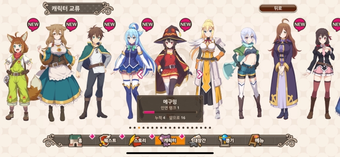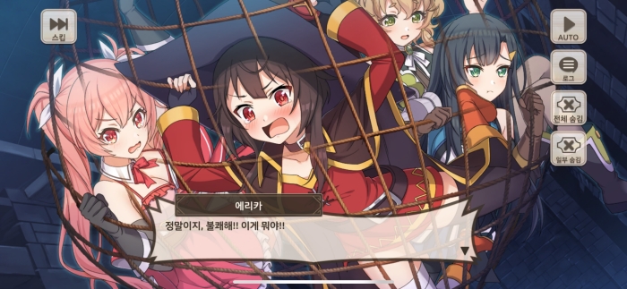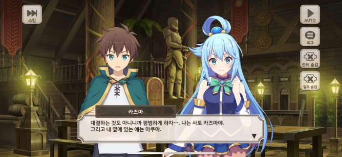 코노스바 모바일의 원작 ‘이 멋진 세계에 축복을!’ 애니메이션을 즐길 수 있다. Live2D로 생동감 있게 구현된 스토리는 원작의 매력을 그대로 느낄 수 있으며 원작을 이미 접했던 유저도 색다른 구성으로 한 번 더 즐길 수 있다.