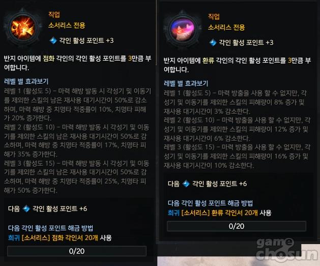 한편, 직업 각인을 포기하고 공용 각인을 사용하는 이른바 국민 소서리스도 연구가 되고 있으나 플레이 스타일 자체가 점화 소서리스와 큰 차이가 나지 않는 반면 점화 소서리스가 화력이 더 우세해 좀 더 지켜봐야 할 것으로 보인다.