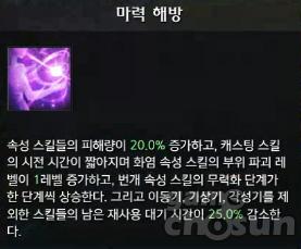 스킬 사용 시마다 쌓이는 신비한 마력을 소모해 마력 해방 상태가 되는 스킬로 지속시간 동안 속성 스킬들의 피해량이 증가하고, 캐스팅이 짧아지며, 이동기, 기상기, 각성기를 제외한 스킬의 재사용 대기시간이 감소한다. 추가로 화염 속성 스킬의 부위 파괴 레벨이 상승하고, 번개 속성 스킬의 무력화 단계도 상승해 압도적인 성능을 보여준다. 때문에 소서리스는 신비한 마력을 잘 쌓고 적재적소에 스킬을 난사하는 플레이가 필수로 요구된다.