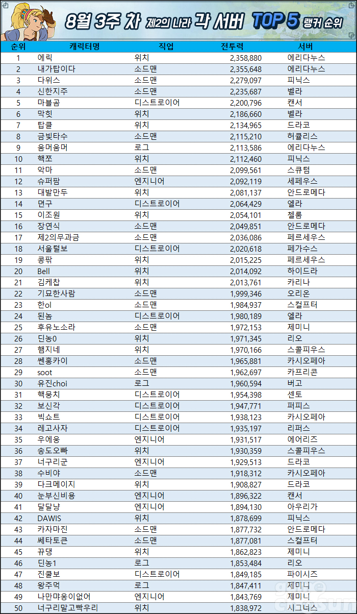 2위부터 5위까지 라인은 지난주와 동일하다. 특히 '내가탑이다'부터 시작되는 소드맨 세 명의 라인은 마치 한 몸처럼 뭉쳐 상위권을 굳건히 지키고 있다. 그 외 캔서 서버 디스트로이어 '마블곰'과 에리다누스 서버 로그 '움머움머'가 각 직업을 대표해 10위권 성적을 유지 중이다.