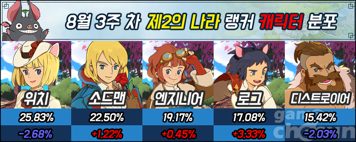 상위권은 여전히 위치가 1위를 고수하는 중이다. 다만 30%에 육박했던 비율은 25.83%까지 하락했고, 소드맨이 지난주에 이어 상승세로 전환하며 그 뒤를 맹렬히 쫓고 있다. 한편 엔지니어는 19.17%를 달성하며 다시 한번 20%의 벽에 도전하고 있다.