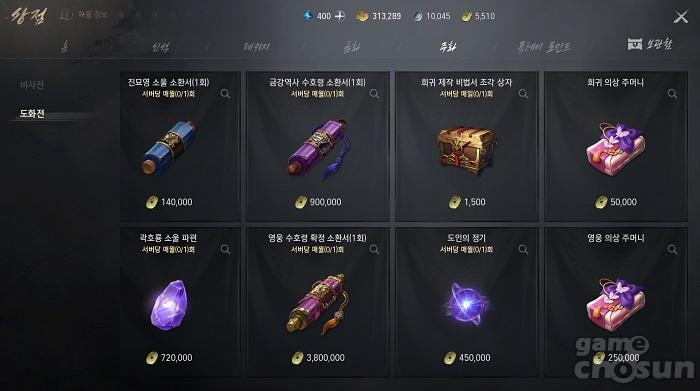 다음으로 도화전은 상점의 주화탭에서 사용 가능한 재화로, '희귀 무공서 선택 상자'와 '진묘영 소울 소환서', '곽호룡 소울 파편', '금강역사 수호령 소환서', '영웅 수호령 확정 소환서', '희귀 제작 비법서 조각 상자', '도인의 정기(무공 성장 아이템)', '의상 주머니' 등으로 교환할 수 있다.