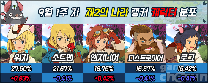 9월 1주 차 랭커들의 캐릭터 분포는 그야말로 고요함 그 자체였다. 랭킹에 진입한 직업과 랭킹 밖으로 밀려난 직업 모두 한두 명 수준이었다. 그나마 위치가 가장 높은 상승세인 0.85%를 기록했지만, 수치로 환산하면 2명에 불과해 큰 변화가 없었음을 증명했다.