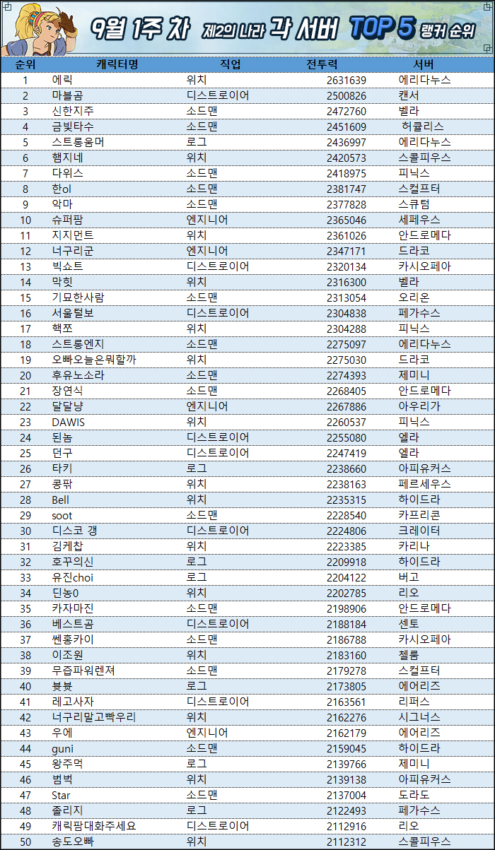 다만, 다가오는 9월 2주 차 랭커들의 캐릭터 분포에는 큰 변화가 있을 것으로 예상된다. 바로 최근 추가된 '비너스' 서버의 랭킹이 안정화 상태에 접어들었기 때문이다. 다음 랭킹에서 오류 없이 랭커들의 순위가 정확히 집계된다면 직업 분포표도 바뀔 것으로 보인다.