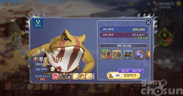 가장 어려운 8 스테이지를 공략했을 때 전투력은 장비 장착 보너스를 모두 받고 87만, 크리티컬 확률 100% 기준 카르트의 공격력은 3만, 준의 공격력은 3만 2천이었다. 카르트와 준이 보스인 '타우'만 공격했을 때 공략 시간은 2분 50초였다. 각 스테이지별 공략 정보는 다음과 같다.