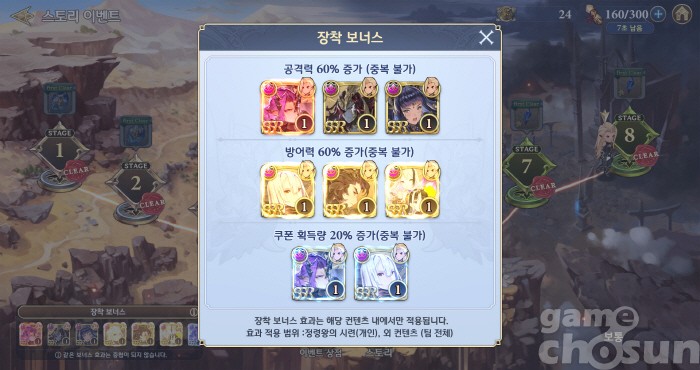 다만 스페셜 퀘스트는 특정 장비를 착용하면 공격력과 방어력, 쿠폰 획득량이 증가하는 버프를 제공하기 때문에 이를 적극적으로 활용하면 추가 전투력 4~50만 가량을 확보할 수 있다. 장착 보너스를 가진 장비는 '카르트'의 SSR 등급 그랑웨폰이며, 제르카와 아자엘, 누네트는 공격력 60% 상승, 하데스와 바라크, 이리스와 아르케는 방어력 60% 상승, 제르카와 하데스는 쿠폰 획득량 20% 증가 효과를 제공한다. 동일 효과를 가진 그랑웨폰은 여러개 착용해도 버프가 한 개만 적용되니 보너스 장비를 전부 착용할 필요는 없다.