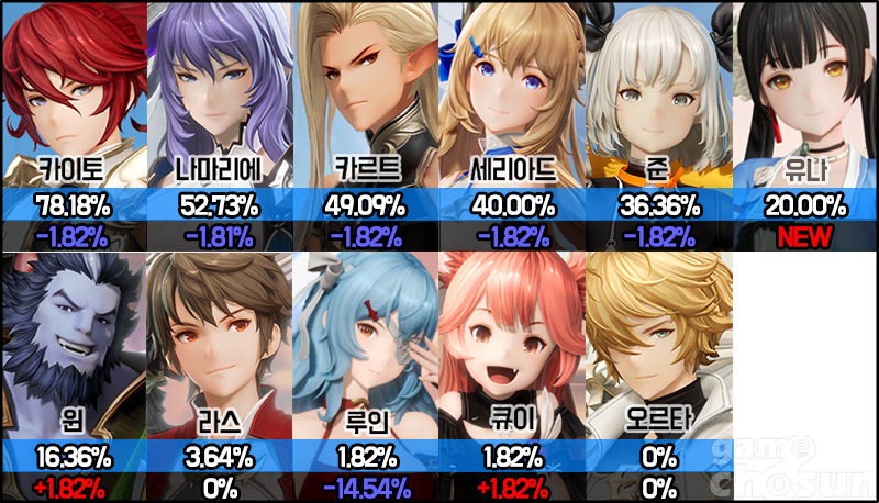 랭커들의 캐릭터 선택률은 신캐릭터 유나의 등장에도 불구하고 전체적으로 큰 변화는 없었다. 상위권 다섯 캐릭터는 랭커 한 명분인 1.82% 감소에 그쳤고, 하위권 역시 윈과 큐이의 선택률이 소폭 상승하는 변화는 있었지만, 대체로 큰 변동사항은 없었다.