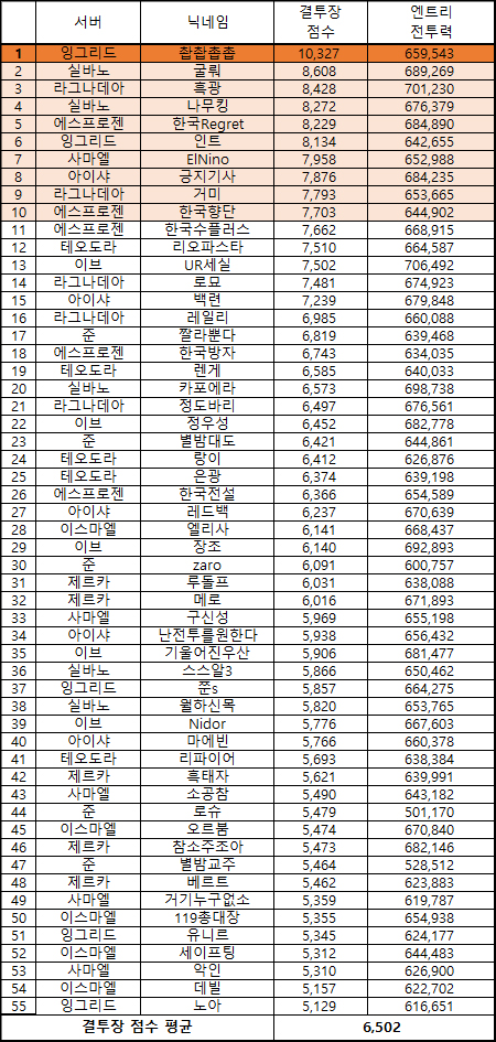 점수 랭킹 1위는 잉그리드 서버 '촵촵촙촙'이 차지했다. 획득한 점수는 무려 10,327점으로 2위와 1,719점이라는 큰 차이도 압도적인 1위를 차지했다. 2위는 실바노 서버 '굴뤄'로 획득 점수는 8,608점, 3위는 전투력 랭킹에서 2위를 달성한 흑광이 8,428점으로 차지했다.