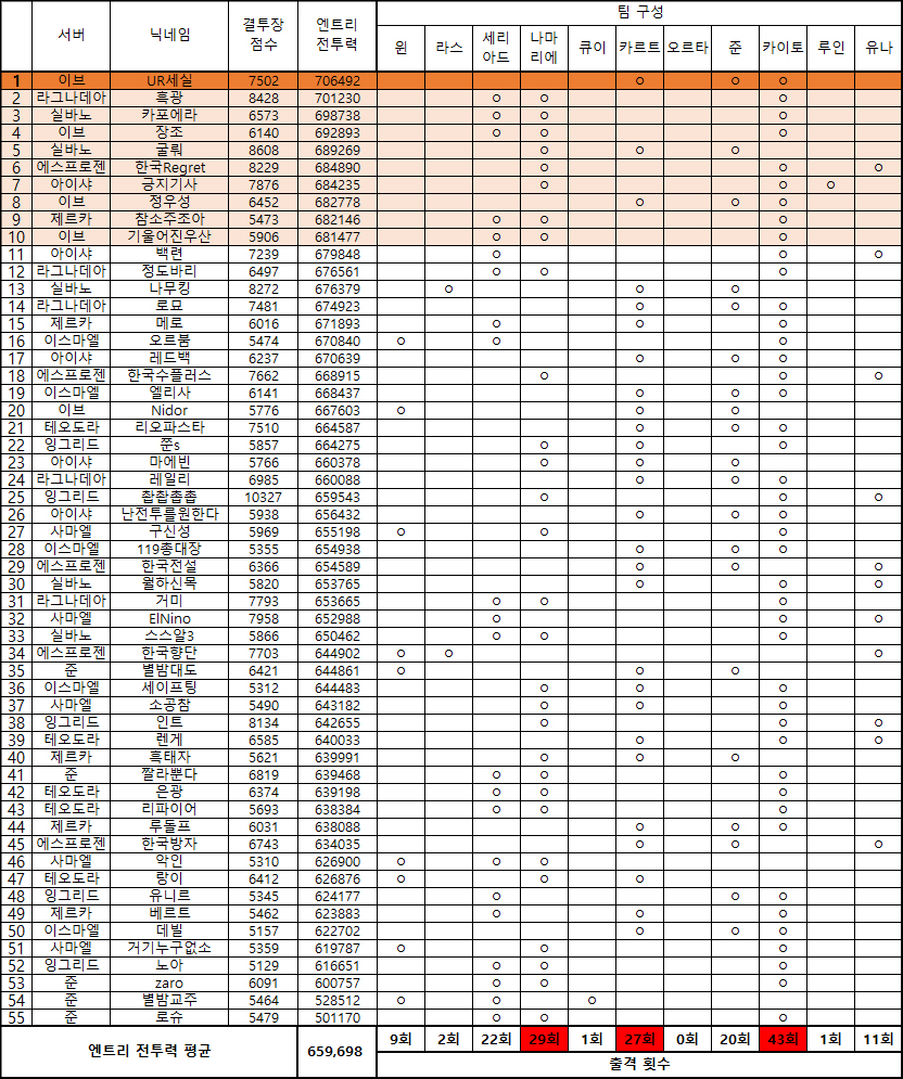 전투력 랭킹에선 이브 서버 UR세실이 4주 연속 1위를 달성했다. UR세실은 팀 전투력 706,492, 팀 편성은 변함 없이 카르트와 준, 카이토를 사용했다. 놀라운 점은 라그나데아 서버 흑광 역서 전투력 70만 점을 넘기며 2위를 차지했다는 점이다. 흑광의 34주 차 팀 전투력은 지난 주 전투력 677,674 대비 23,556이나 상승한 701,230을 기록했다.