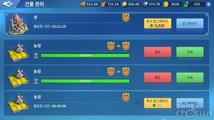 또 건설 및 연구, 병사 훈련 시에는 시간을 감소시켜주는 아이템이 존재하며, 이를 얼마나 잘 활용하느냐가 발전 속도에 큰 영향을 준다. 따라서 이용자는 각종 콘텐츠를 즐기면서 건설 및 연구, 병사 훈련 시간 등을 감소시켜주는 아이템을 보상을 최대한 많이 확보해야하며, 영지 발전에 필수적인 자원을 외부 채집지에서 수급해야만 한다. 이를 통해 더욱 강력한 군단을 양성하면서 앞으로 있을 전투에 대비해나간다.