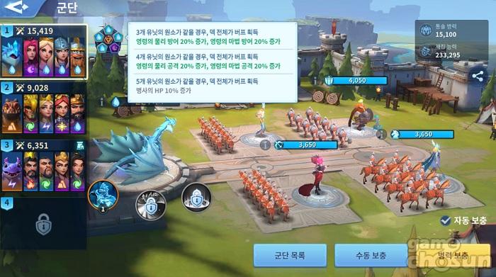 전투에 있어서도 치열한 수싸움을 벌일 수 있도록 준비한 모습이다. 각 전투를 치르게 되는 군단은 2개의 전열과 2개의 후열, 그리고 드래곤으로 이뤄지며, 해당 위치에 각기 다른 병종과 포지션, 속성 등을 가진 영웅을 배치해 자신만의 전술을 펼치는 것이 가능하다.