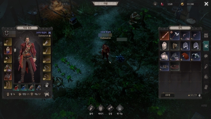 ‘언디셈버’ 캐릭터의 장비 착용 및 인벤토리 확인 화면