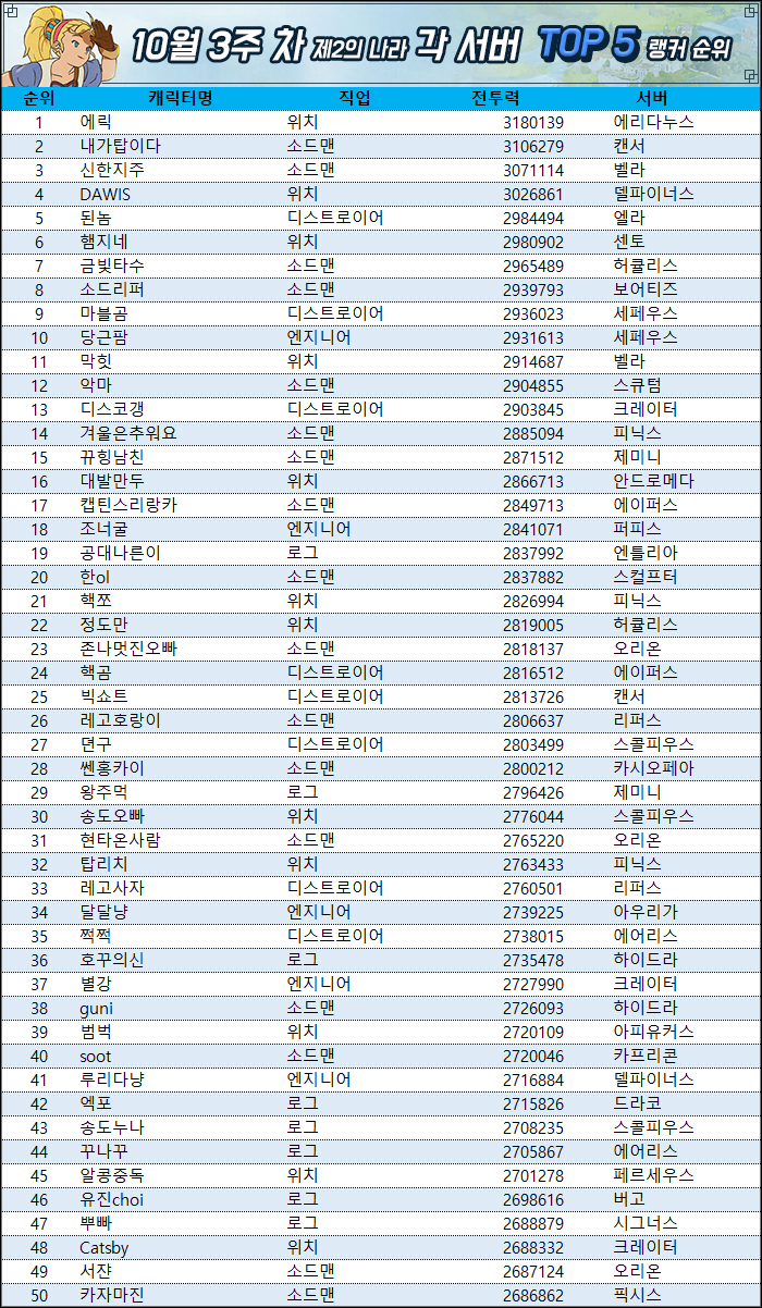 랭커들의 전투력은 마땅한 전투력 상승 콘텐츠가 추가되지 않아 상승폭이 미미한 편이다. 그래도 캔서 서버 '내가탑이다'와 델파이너스 서버 'DAWIS'가 각각 전투력 300만을 돌파하면서 각 서버 최고 전투력 기록을 갱신하는 모습을 보여줬다.