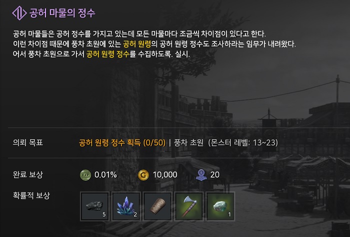 마을 의뢰는 캐릭터 당 하루 8회를 수행할 수 있는 몬스터 처치 미션으로, 해당 콘텐츠를 꾸준히 이용한다면 장비 제작에 필요한 각종 재료 아이템을 획득 가능하다. 장비 제작에 필요한 가장 기본적인 재료로는 위그드람이 있으며, 이와 더불어 마렷 깃든 정수와 구드벨 등이 있다.