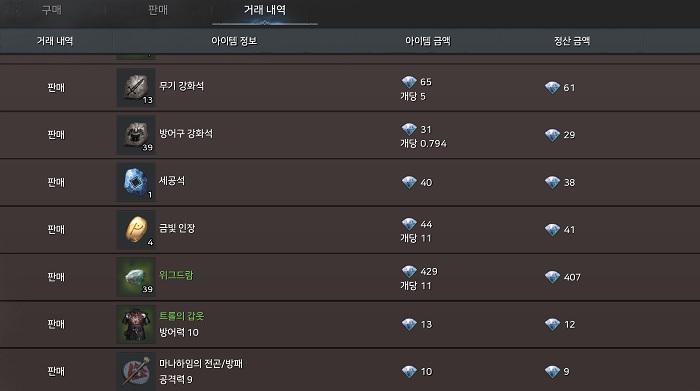 특히 유료 장신구를 구입해 장착한다면 기본적으로 캐릭터가 착용해야할 모든 장비를 갖추게 되는 것이므로 다이아를 빠르게 수급하는 것을 권장한다. 거래소에 판매할만한 아이템으로는 위그드람과 마렷 깃든 정수, 구드벨, 세공석, 여명의 천, 황연의 천, 이발디 강화석, 세공석 등이 있으며, 자신 캐릭터 이외 클래스의 스킬 기술서 등을 꼽을 수 있다.
