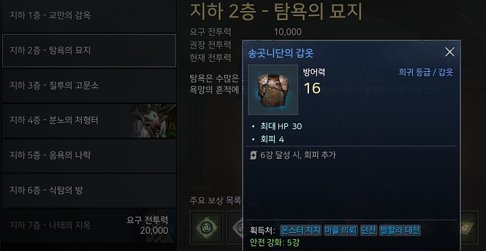 또한 지하 2층 - 탐욕의 묘지는 전투력 10,000 달성 시 입장 가능하며 '송곳니단의 투구' 및 '송곳니단의 갑옷'을 드랍한다. 따라서 캐릭터 전투력 10,000을 달성한 후 지하 감옥만 꾸준히 플레이해도 방어구 4종을 획득할 수 있는 루트가 열리는 것이다.