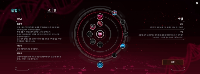 특성은 게임 내에서 총 5개의 특성을 활용할 수 있게 설계되었으며, 각 특성군은 ‘파괴’, ‘저항’, ‘지원’ 특성으로 구분된다.