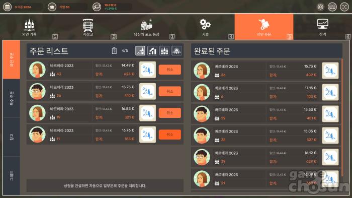 와인 판매는 일반적인 와인 주문과 특수 주문 두 가지로 나뉜다. 와인 주문은 고객들이 매번 새로 제시하는 가격과 수량이 적힌 주문 리스트를 보고 마음에 드는 손님에게 와인을 파는 방식이다. 대형 레스토랑에서 대량으로 주문할 경우 그만큼 마진률이 낮지만, 반대로 소량 구입하는 손님만 상대하다보면 내가 원하는 가격에 팔지 못하거나 재고가 남아버리는 경우도 있다. 와인의 생산년도와 품질, 잔고를 생각해 판매 전략을 바꿔가며 부를 축적하는 것이 핵심이다.