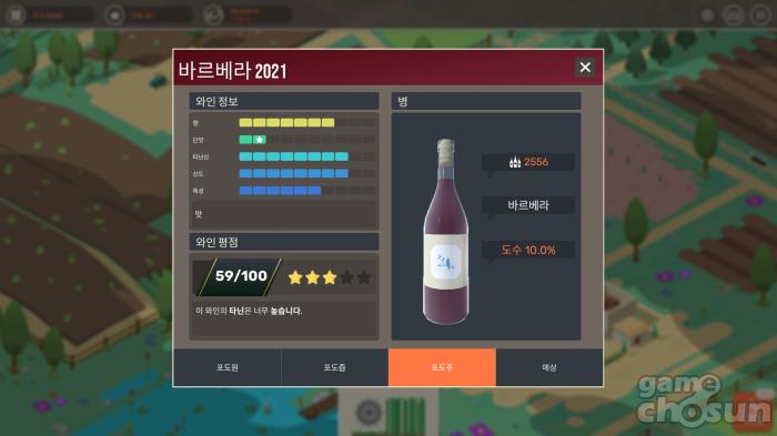 이렇게 만든 와인은 시음을 통해 품질을 평가받게 된다. 와인의 종류에 맞춰 알맞은 향과 산도를 가진 상품을 만들었다면 그만큼 평가가 오르고, 좋은 가격을 받을 수 있다. 품질을 낮추는 대신 대량 생산으로 박리다매를 노릴 것인지, 아니면 고품질 소량 생산으로 프리미엄 와인을 만들 것인지는 유저의 자유다.