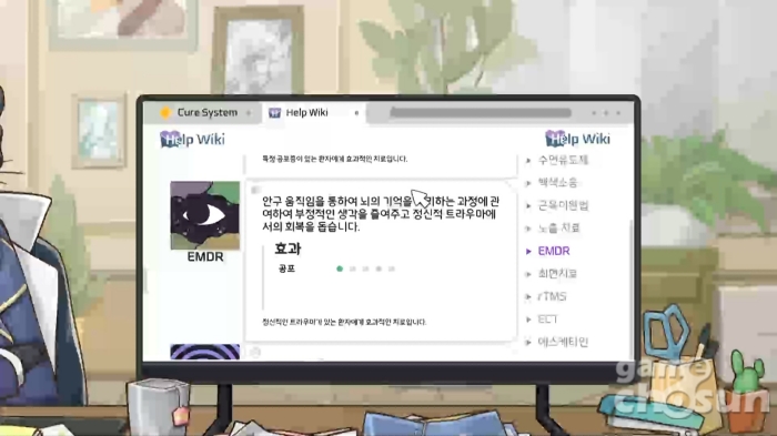 서브 캐릭터 치료를 위한 미니게임은 그라운딩 훈련, 같은 그림 맞추기, 심호흡, 노출 반응-금지까지 환자에 맞춘 네 가지가 있다. 성공할 경우 다음번엔 좀 더 높은 난이도로 진행할 수 있으며 실패해도 치료도에 영향을 주진 않으니 부담 없이 즐길 수 있다.