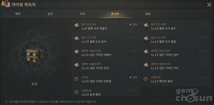 흑장로의 지팡이는 '목재' 200개가 재료로 필요하다. 목재는 말하는 섬의 발루 오크 부락과 몰락한 자들의 흔적, 그리고 글루디오의 포도밭 및 비탄의 땅 등에서 얻을 수 있다.