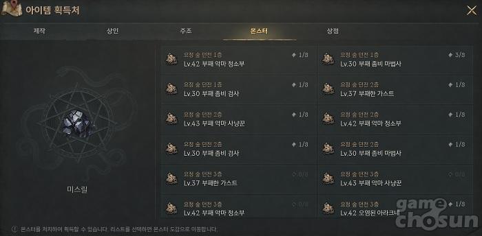 마지막으로 희귀 무기 제작 비법서 외에 각 희귀 무기 제작에 필요한 재료에 대해서도 살펴봤다. 데스 블레이드, 미스릴 도끼, 화염의 활, 달의 장궁, 마력의 단검, 미스릴 대검 등에 공통적으로 요구하는 '미스릴'은 요정 숲 주변의 요정 숲 던전 1~3층에서만 획득할 수 있다. 해당 던전에서 등장하는 모든 몬스터가 미스릴을 드랍하므로 자신의 레벨 수준에 따라서 층수를 결정해 사냥을 진행하면 된다.