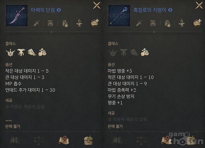 마법사 클래스는 '흑장로의 지팡이' 혹은 '마력의 단검' 중에서 선택하게 될 것으로 보인다. 단, 흑장로의 지팡이는 마법 스킬을 사용할 수 있는 수준에 도달해서야만 제 성능을 낼 수 있으므로, 아직까지 성장 단계에 있는 마법사 클래스 이용자에게는 마력의 단검이 더욱 효과적이다. 특히 마력의 단검은 MP 흡수 및 언데드 추가 대미지 옵션이 있기에 마법 스킬 사용의 부담이 줄어들 뿐만 아니라 언데드 사냥터에서 높은 효율을 낼 수 있다.