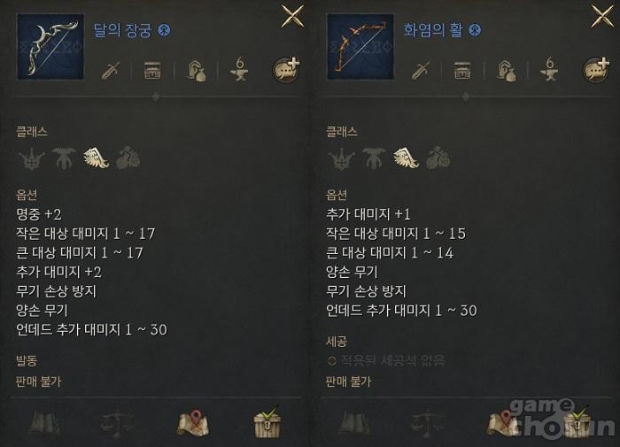 | 달의 장궁 | 명중+2 작은 대상 대미지 1~17 큰 대상 대미지 1~17 추가 대미지 +2 무기 손상 방지 양손 무기 언데드 추가 대미지 1~30 |