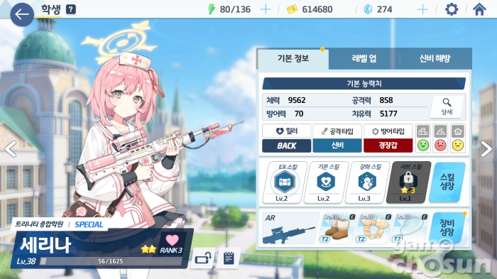 세리나는 EX 스킬과 기본 스킬이 모두 파티원의 체력을 회복하는 전형적인 힐러로 코스트 소모 없이 탱커 뒤편의 생채기 난 딜러까지 케어해줄 수 있어 힐러가 필요하다면 1순위로 기용되는 캐릭터다.