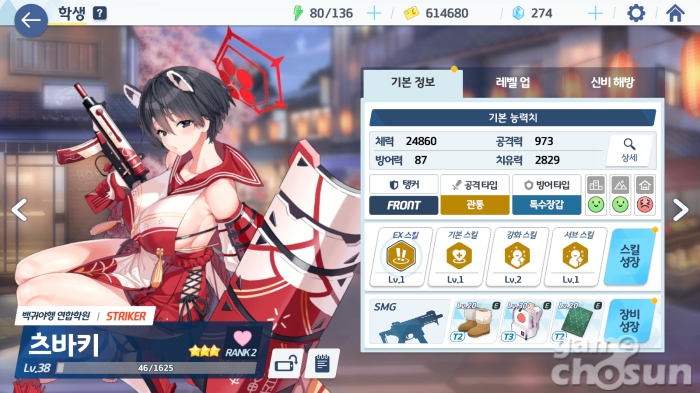 츠바키는 탱커라면 응당 가지고 있어야 하는 도발과 자체 회복을 가지고 있으며 강화 스킬과 서브 스킬까지 방어력, 피격 대미지 감소 등 모든 스킬이 탱킹에 최적화된 알짜배기 캐릭터다. 여기에 방어타입이 특수장갑이라는 점까지 합쳐져 탈 2성급의 성능을 가지고 있다.