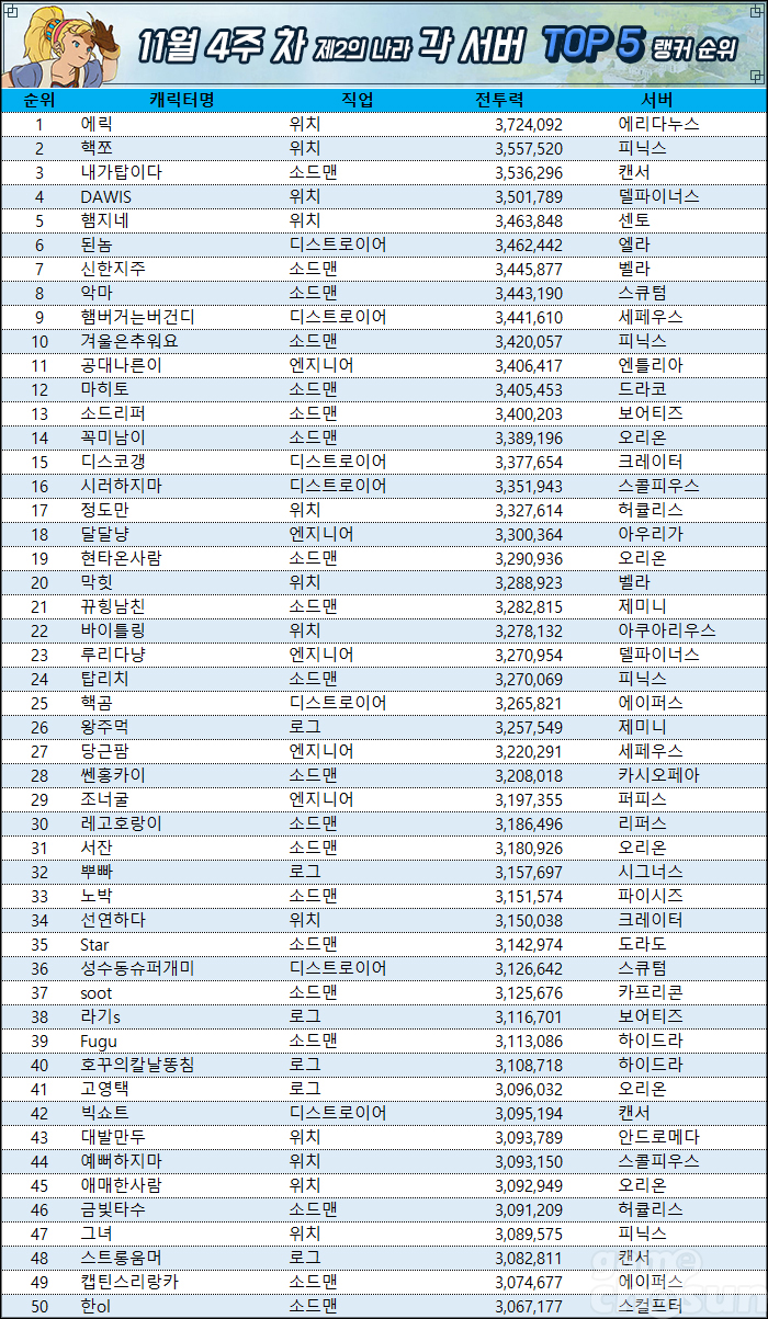 각 직업 1위는 위치 1위 에리다누스 서버 '에릭'(전 서버 1위), 소드맨 1위 캔서 서버 '내가탑이다'(전 서버 3위), 디스트로이어 1위 엘라 서버 '된놈'(전 서버 6위), 엔지니어 1위 엔틀리아 서버 '공대나른이'(전 서버 11위), 로그 1위 제미니 서버 '왕주먹'(전 서버 26위)이다.