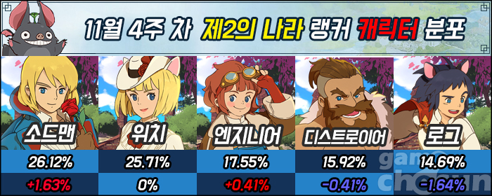 랭커 직업 분포는 소드맨이 부동의 1위 위치를 넘어 점유율 1위를 기록했다. 그 뒤를 위치, 엔지니어, 디스트로이어, 로그 순서로 추격 중이다.