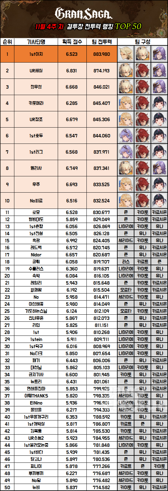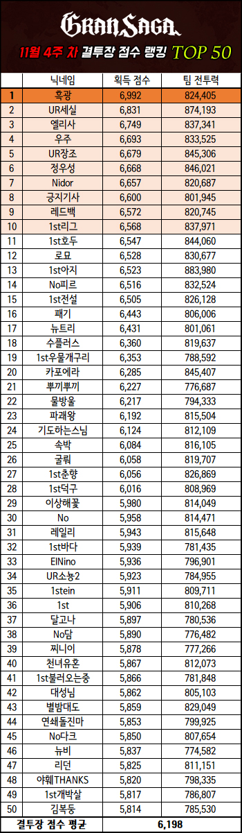 2위는 다시 한번 전투력 1위 자리를 얻기 위해 맹렬히 추격 중인 UR세실이 차지했으며, 8위 '엘리사'까지 지난 랭킹과 큰 변화는 없었다. 다만, 11위였던 '우주'가 이번 랭킹에서 9위로 두 계단 상승에 성공했고, 그 여파로 'No피르'는 9위에서 10위로 밀려났다.