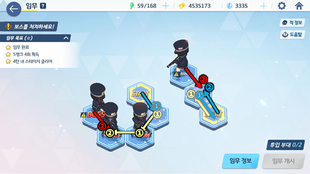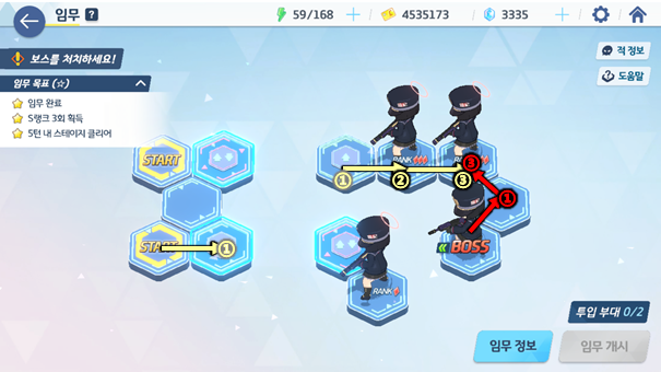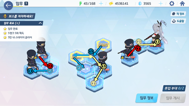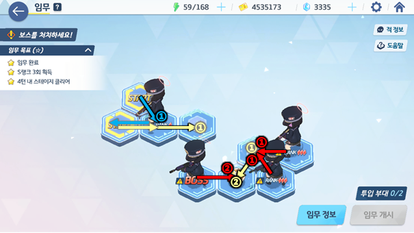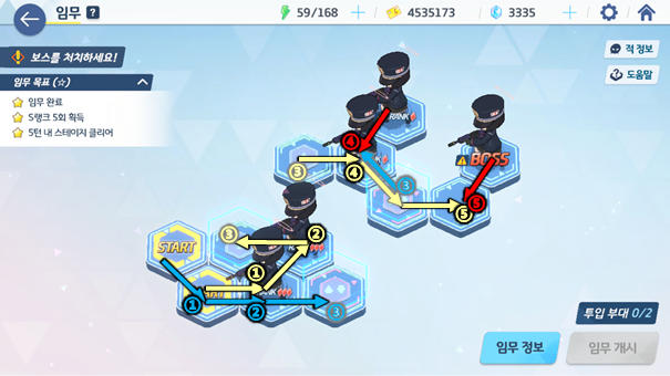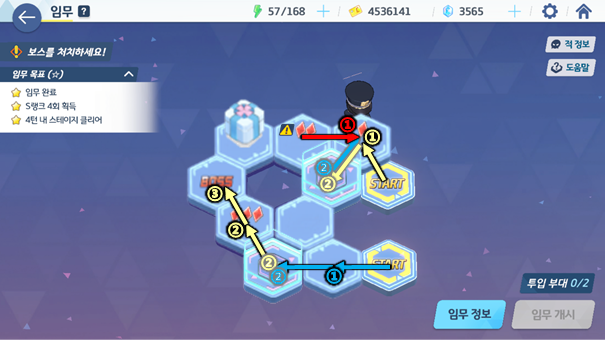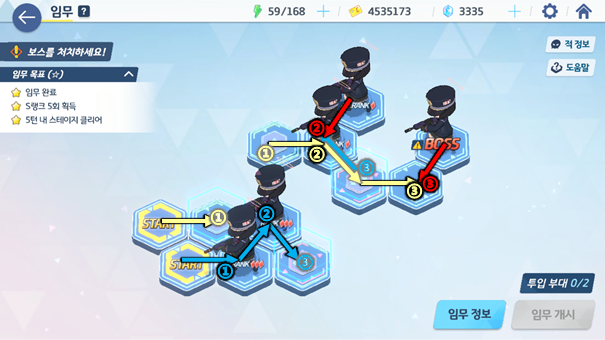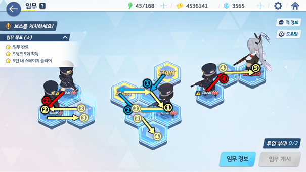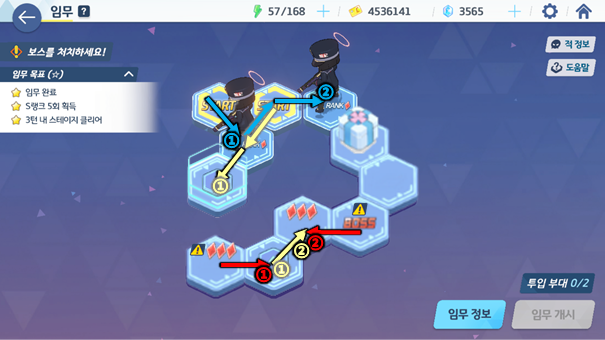 각 스테이지 별로 타일을 보고 분대를 움직여 전투를 벌이거나 아이템을 얻게 되는데 이때 몇 턴 안에 전투를 마쳤냐에 따라 스테이지 3별 및 도전과제를 달성할 수 있다. 두 목표 모두 청휘석을 얻을 수 있어 가치가 높다. 특히, 하드 스테이지의 경우 맵의 구조가 제대로 보이지 않아 특정 위치에 놓여있는 청휘석까지 획득하면서 한 번에 3별을 달성하기엔 매우 어렵게 느껴진다.
