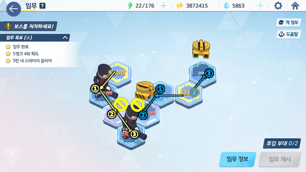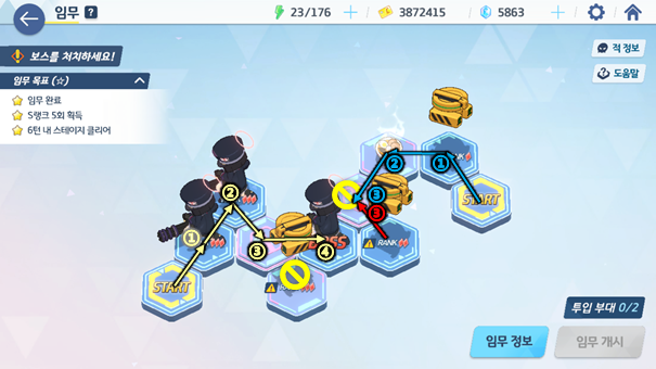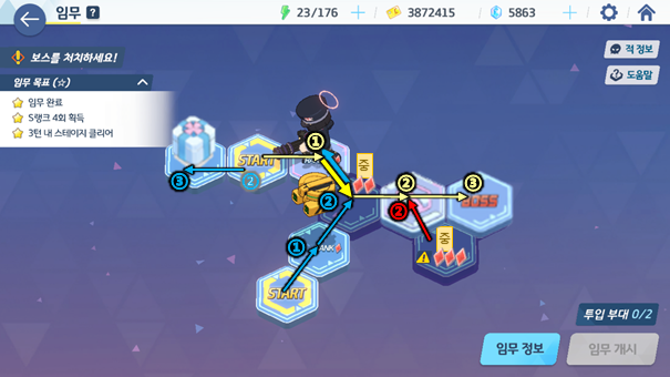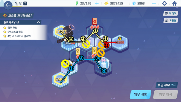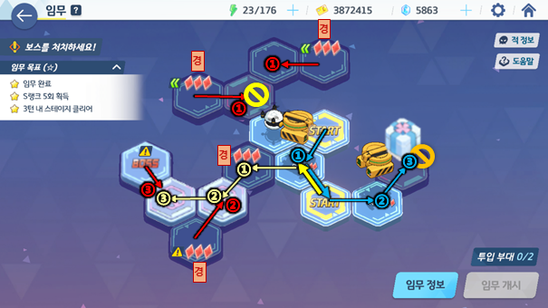 스테이지 3별과 도전 과제 모두 상대해야 하는 적의 수가 같으니 기왕이면 한 번에 도전 과제까지 목표로 스테이지를 클리어하는 것이 좋다.