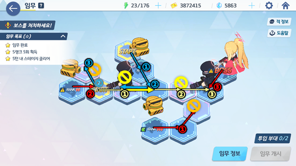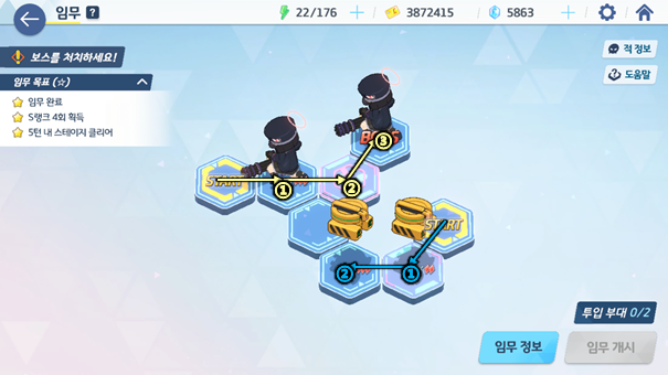 각 스테이지 별로 타일을 보고 분대를 움직여 전투를 벌이거나 아이템을 얻게 되는데 이때 몇 턴 안에 전투를 마쳤냐에 따라 스테이지 3별 및 도전과제를 달성할 수 있다. 두 목표 모두 청휘석을 얻을 수 있어 가치가 높다. 특히, 하드 스테이지의 경우 맵의 구조가 제대로 보이지 않아 특정 위치에 놓여있는 청휘석까지 획득하면서 한 번에 3별을 달성하기엔 매우 어렵게 느껴진다.