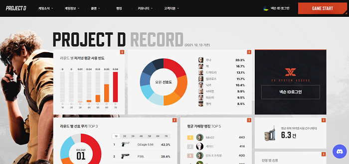 프로젝트 D를 플레이해보기 위해 홈페이지를 접속하면 반겨주는 화면은 현재까지 플레이했던 데이터를 정리해 표나 그래프로 보여주는 장면이다. 라운드 별 저거넛 사용 빈도 및 선호 무기, 요원 선호도, 진영 별 승률, 캐릭터별 KDA 및 승률 등 주요 정보들을 플레이어가 손쉽게 확인할 수 있게 했다.